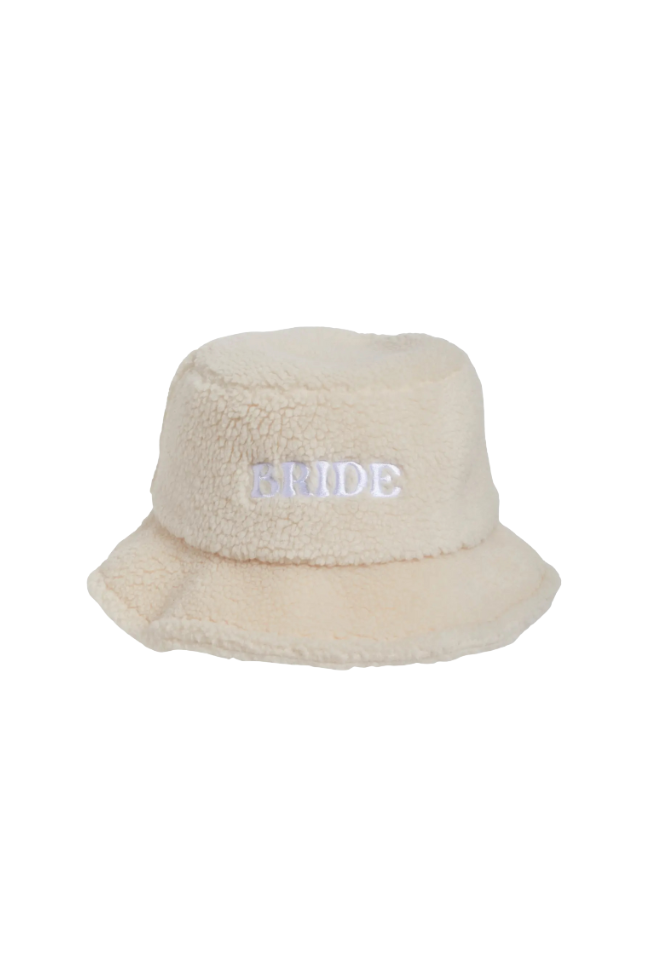 Bride Sherpa Bucket Hat – A playful, plush accessory that brings a chic twist to casual bridal style.