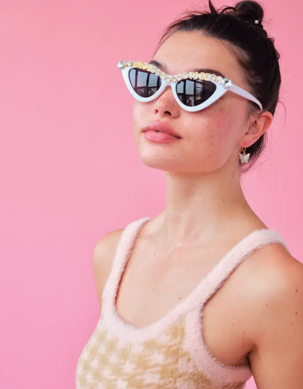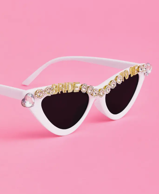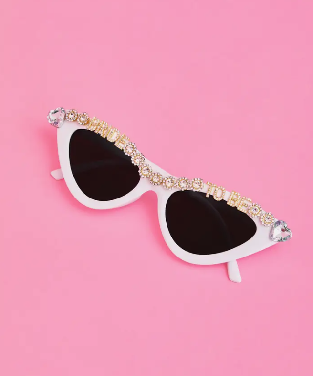 Embody "That Bride" with these sunnies. We all know "That Girl", but have you heard of "That Bride"? In essence, it's the definition of having your shit together. White cat eye frames with black lenses. "Bride To Be" zirconia letters + rhinestone beads.