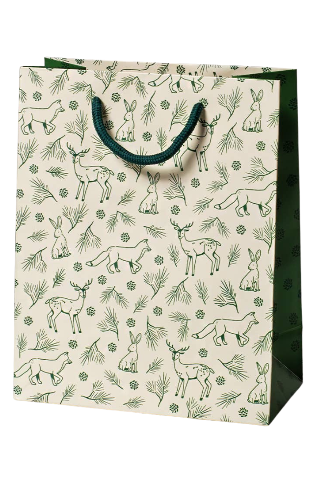 Tis the season to get the gifts a giving! These forest animals, including deer, foxes and hares, are printed in dark green on an off-white background. A pine cone print decorates the sides. You will love this versatile gift bag for any occasions!