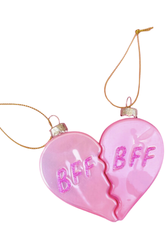 Pink BFF Christmas ornament set with glitter details, the perfect way to add a bit of sweetness to your tree. This is a set of 2 ornaments. All ornaments are hand-blown and will have slight differences. This variability is part of what makes this handmade ornament special!