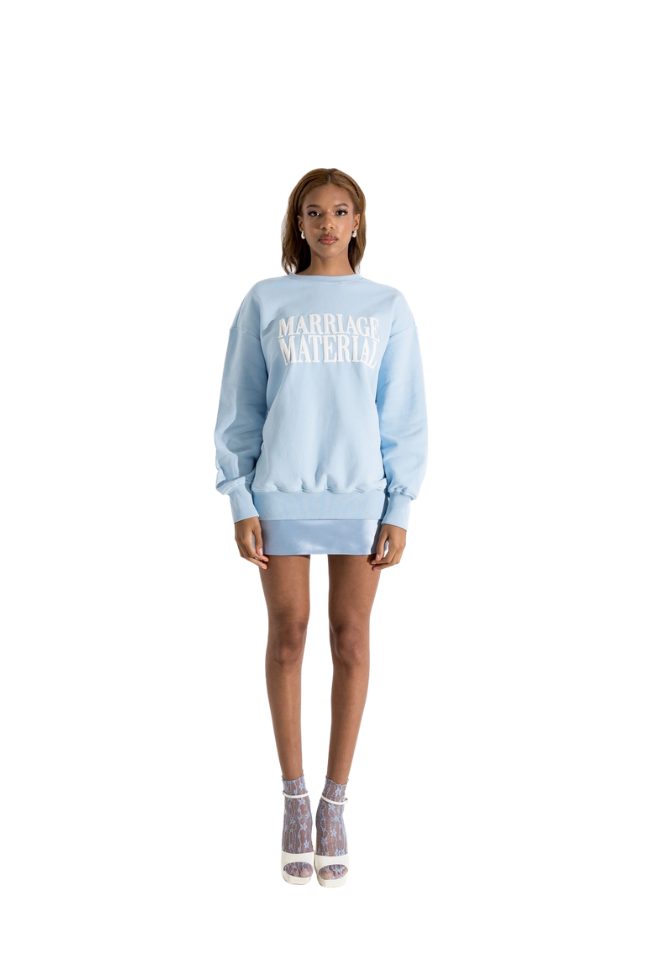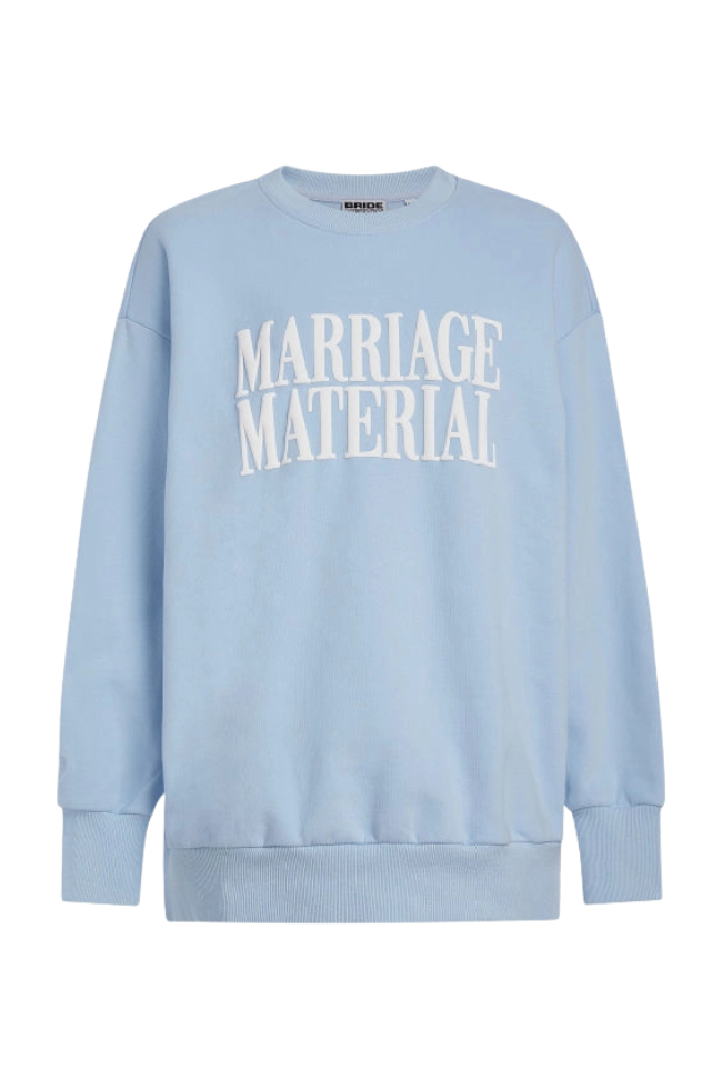 Let everyone know you’re Marriage Material™, in our branded new sweatshirts! The perfect 'something blue' color and oversized fit in super soft fleece!