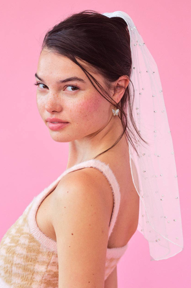 Pearls on a veil? Groundbreaking. Channel your inner Audrey Hepburn with this vintage inspired veil. Perfect for brunch, bridal showers and of course bachelorettes - she really does it all! Pearl dotted veil 22” from top to bottom.