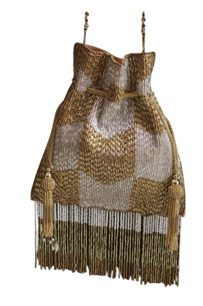 Give Old Hollywood sophistication with this hand crafted beaded bag which features long beaded tassels and a beaded wristlet.