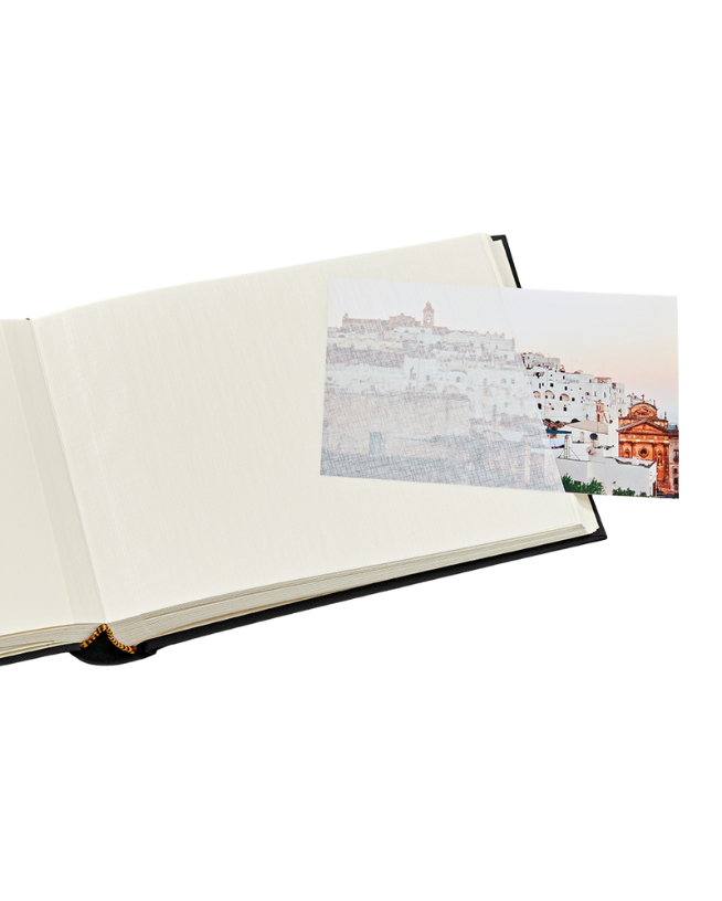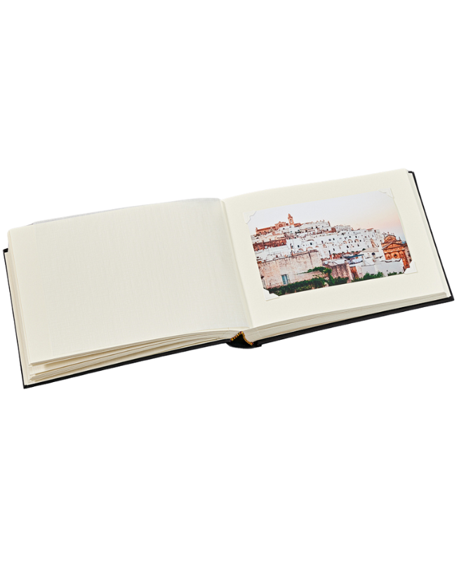 This Photo Album is handcrafted in Europe and features an elegant cover made with premium linen. It includes 80 cream-colored pages bound together with traditional stitching, and archival quality glassine which provides extra protection for your photos.