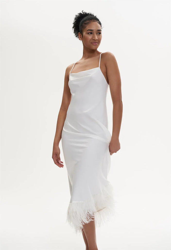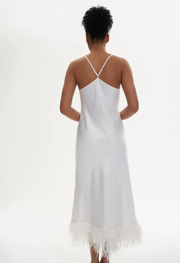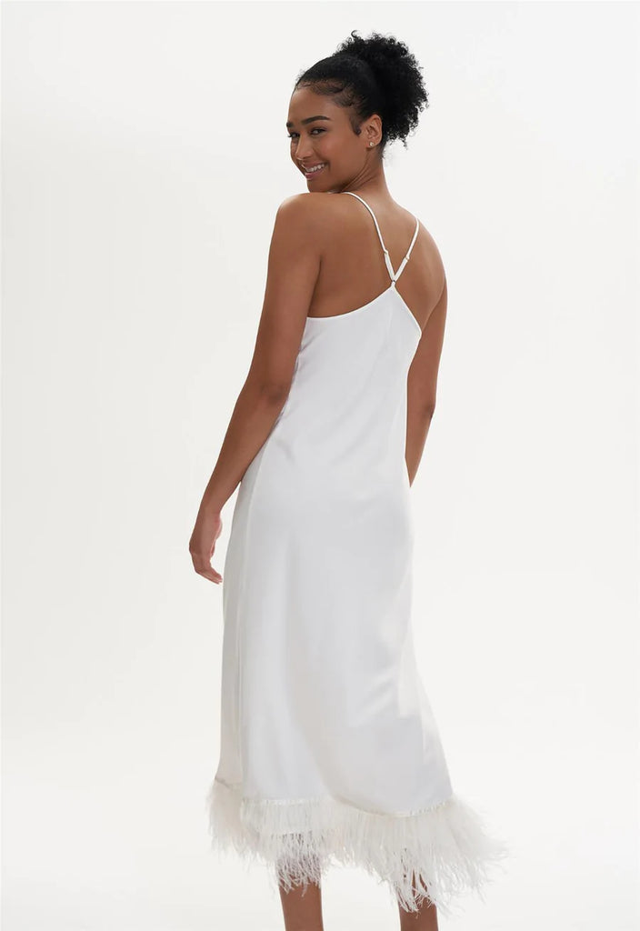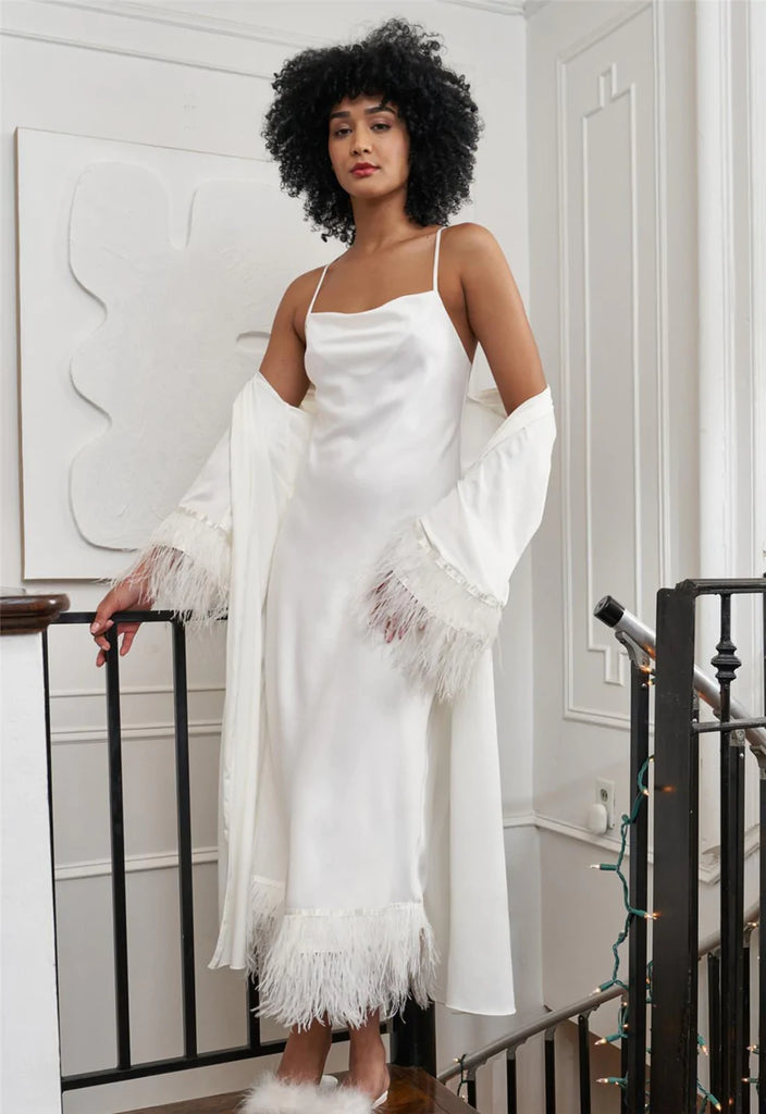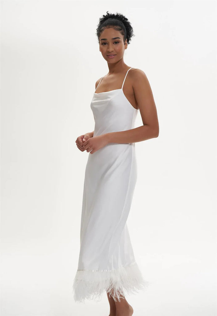 A genteel addition to the Swan group, the newly created Swan Gown provides an elevated appeal to the playfulness of love. Cascading in charmeuse and feathers at the hem, this gown delivers a wow moment. Features a cowl neckline and adjustable straps. Make it a perfect pair with the Swan Robe.