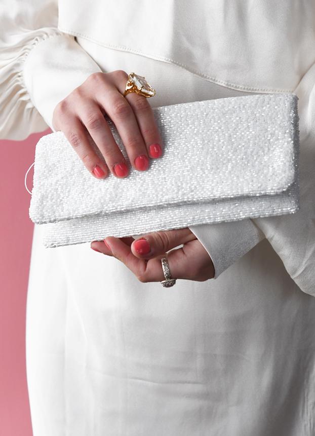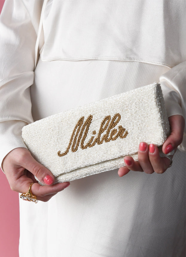 A white beaded clutch with lettering in your choice of color and font. Add your personalization to the outside, inside or both! This clutch is entirely hand-beaded & made to order.