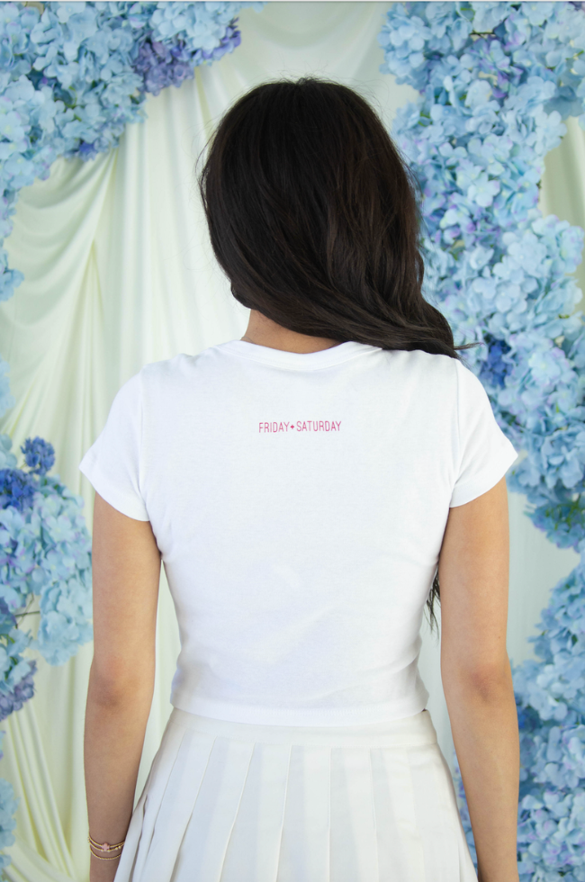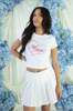 Wear your heart on your chest with the perfect cropped addition to your bridal wardrobe. This white baby tee features a fitted silhouette with short cap sleeves and a trendy cropped hem, showcasing a hand-drawn heart and "Just Married" script in a rich cherry red. It’s the ultimate cool-girl piece for your honeymoon and post-wedding festivities.