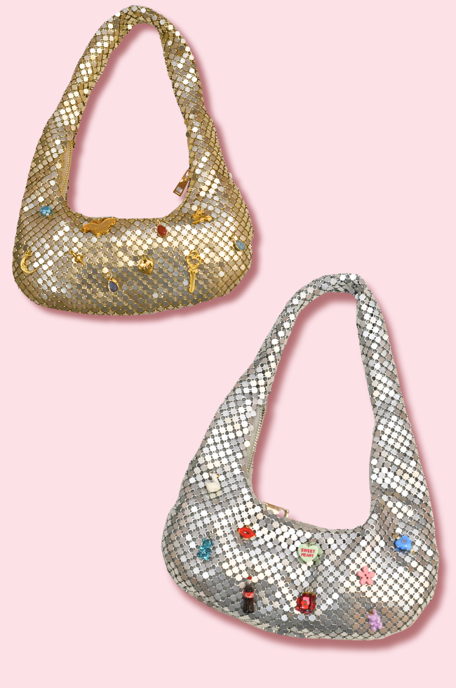Design your own charmed sequin bag by selecting 9 charms from our curated trays and choosing your bag in gold or silver. We’ll teach you how to attach each charm using jump rings and pliers — no experience needed. Create a one-of-a-kind accessory that’s totally you and ready to shine. <3