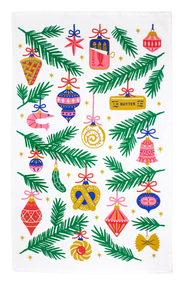 This Christmas tree scene comes decorated with festive ornaments, including those trending food-shaped ornaments: pretzel, sardines, butter, prawn, cinnamon roll, farfalle, and cherry center cookies. Colorful ornaments of blue, pink, red, and gold hang from green boughs of fir. Fun for your holiday kitchen, this cotton flour sack towel is designed here at the Seltzer Goods studio and hand-silkscreened in India.