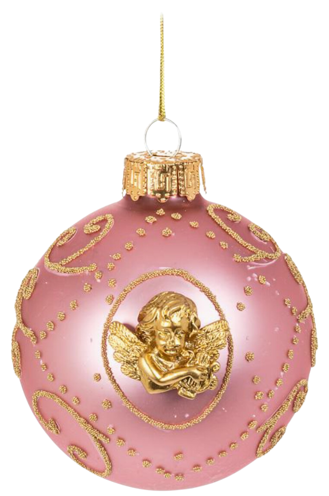 Add a heavenly touch to your holiday decor with this elegant Pink Cherub Ornament. Crafted out of glass, this exquisite ornament features an intricate geometric design in golden glitter highlighted by a golden cherub for an angelic addition to any Christmas tree.