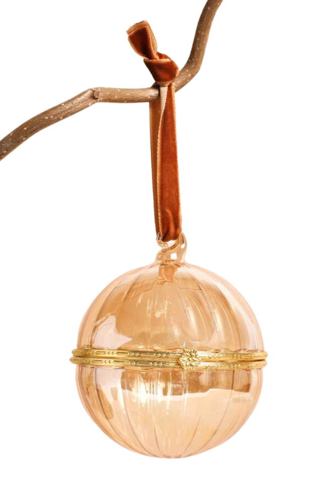 A glass bauble with a soft glow and classic round shape Finished with an elegant gold trim and a hinged opening The perfect size for holding a small treat, note or keepsake Gift to friends, family, or those who love decorating for the holidays.