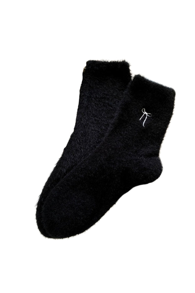 Fuzzy crew socks with embroidered bow detail. One Size.