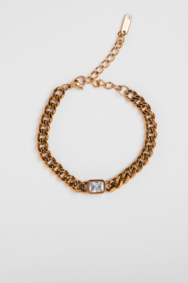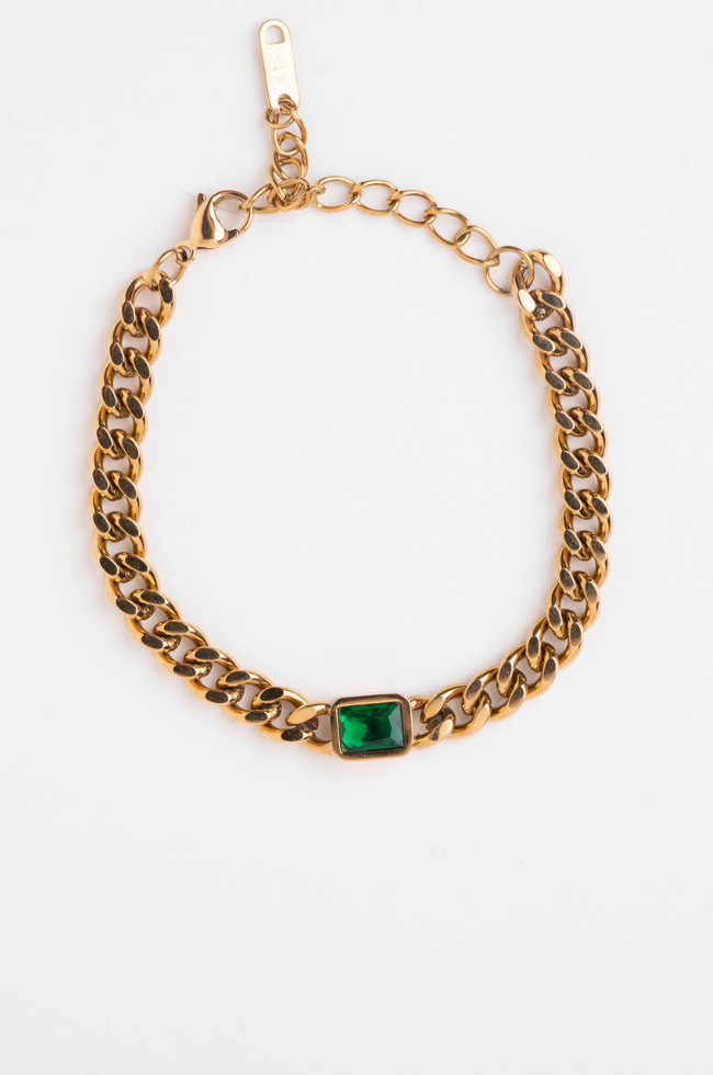 This Gold Cuban Chain Bracelet features a Clear or Emerald Baguette Gemstone.