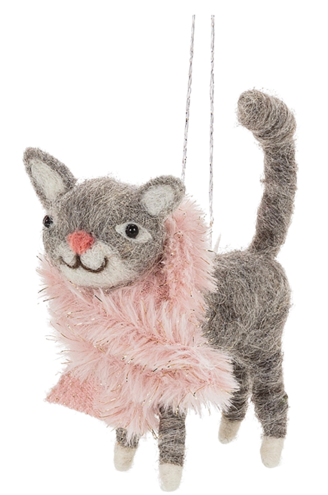 Add the purr-fect accent to your holiday decor with this charming Cat with Scarf Ornament. Crafted out of wool felt and styro, this cuddly grey kitty comes with a fluffy pink scarf wrapped around its neck for a charming compliment to any Christmas tree.