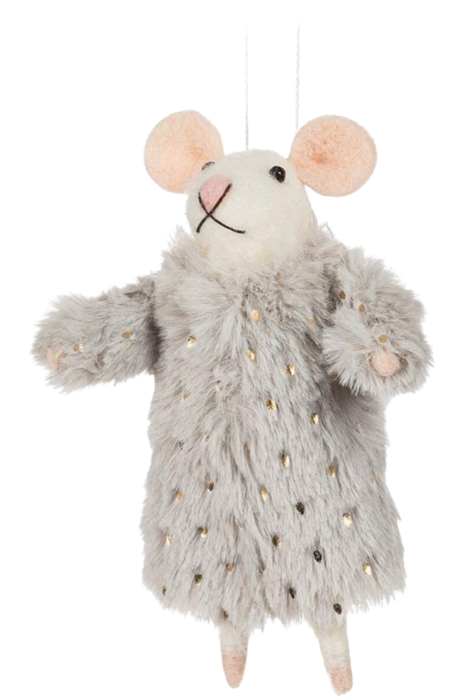Make your holiday decor more marvelous with this majestic Fancy Mouse Ornament. Crafted out of wool felt and styro, this plush mouse sporting a fabulous furry coat accented with golden beads is perfect for any fashion-forward family member's Christmas tree.